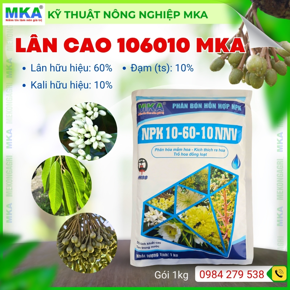 Lân cao tạo mầm 10-60-10 MKA là phân bón NPK hòa tan chứa hàm lượng lân cao chuyên dụng (lân hữu hiệu P₂O5) hàm lượng 60%, bổ sung đạm và kali cân đối 10% giúp hỗ trợ già lá nhanh, thúc đẩy quá trình phân hóa mầm hoa và ra hoa nhanh chóng. Phân bón 10-60-10 MKA là phân bón lá dạng NPK hòa tan có độ tan tốt dùng để tưới gốc giúp kích rễ, phun lá giúp thúc đẩy già lá nhanh, phun hoa giúp tạo mầm và ra hoa đồng loạt.